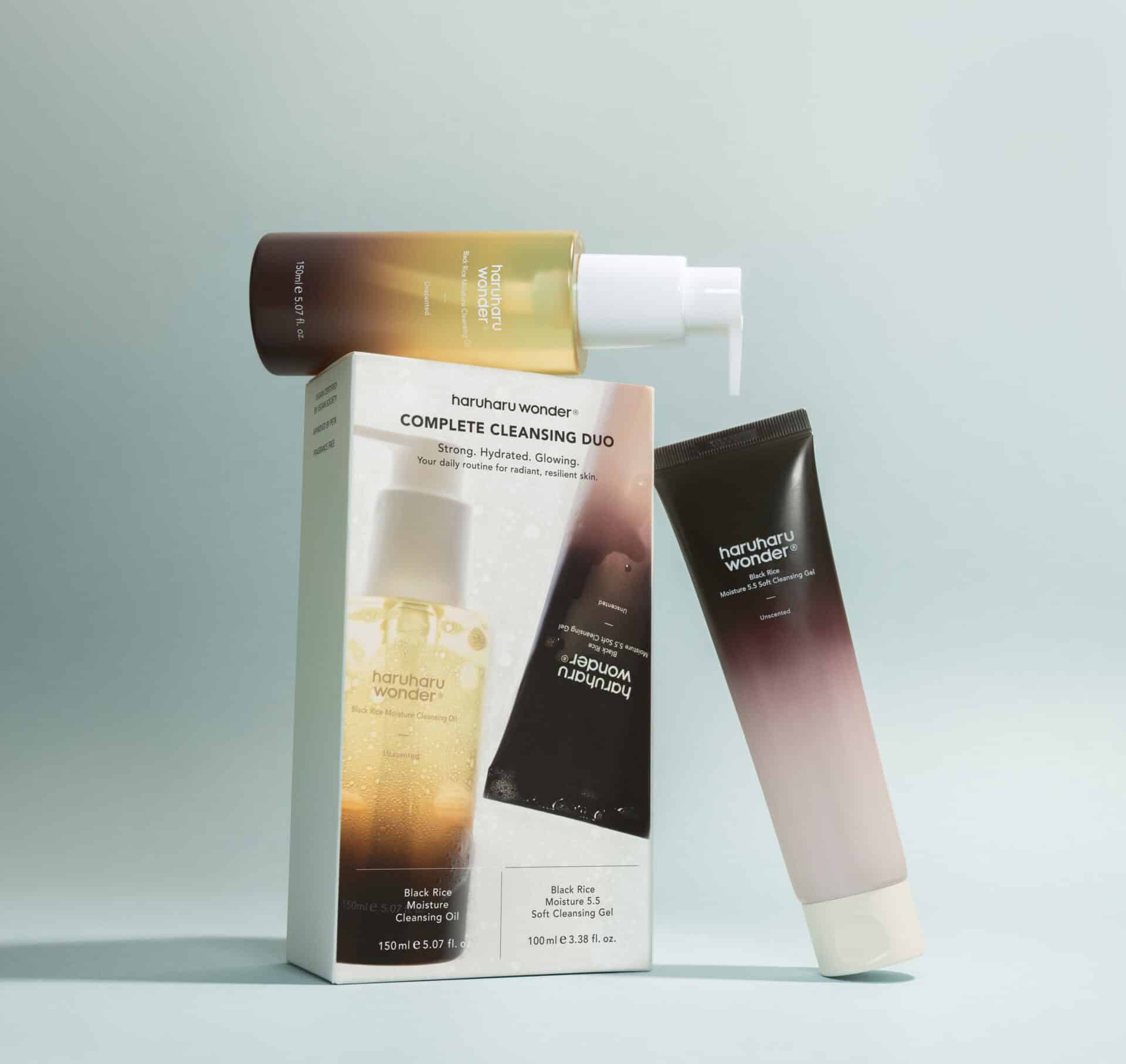 The Haruharu Wonder Complete Cleansing Duo Kit (AED 155) distils the Korean double cleanse into two straightforward steps. A lightweight oil cleanser melts away makeup, SPF and daily buildup, formulated with naturally derived oils—including rice bran, olive, sunflower, macadamia and jojoba—and enriched with Vitamin E and antioxidant-rich fermented black rice. It’s followed by a gentle, pH-balanced gel cleanser that clears any remaining impurities while supporting the skin barrier. The result is skin that feels clean, soft and balanced without tightness or irritation.