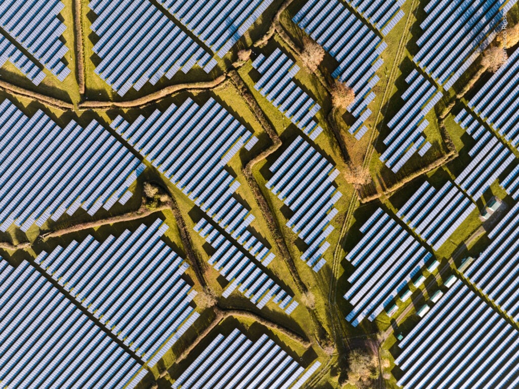 Solar Waves Francesco Russo (UK/Italy) shows rows of solar panels stretch across the English landscape like ripples on a water’s surface. The panels had to be carefully organised around the divisions between pastures. The result is a pattern that resembles the shapes of bodies of water. This image is part of a project to document the relationship between nature and industry along the River Severn, which flows near this solar farm.